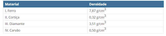 2. Observe a tabela a seguir e indique quais materiais flutuam na água (dH20 = 1 g/cm3).